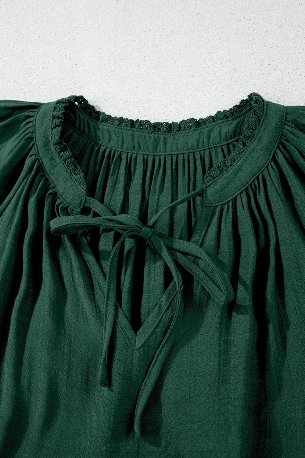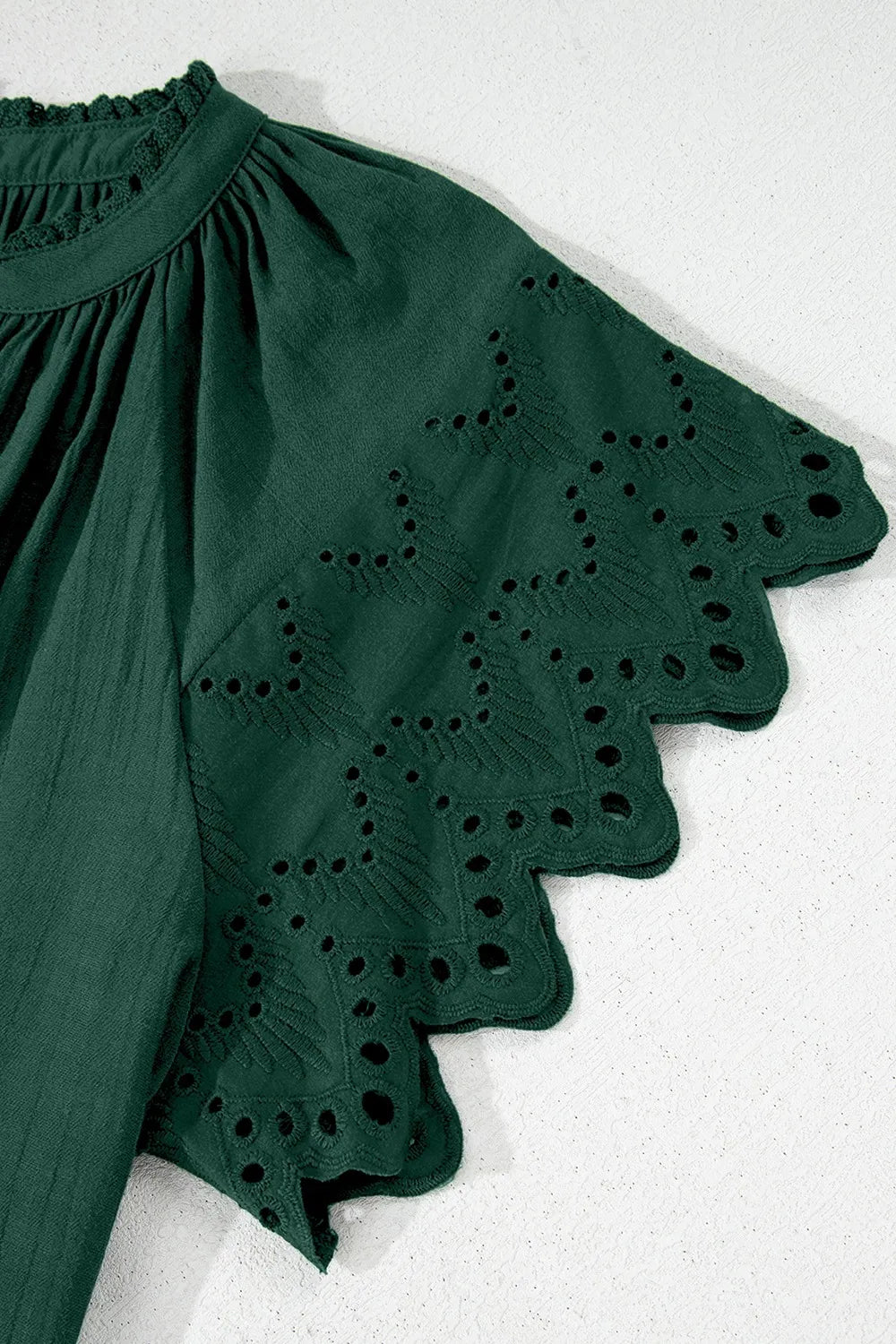 Eyelet Embroidered Sleeve Tie Neck Blouse