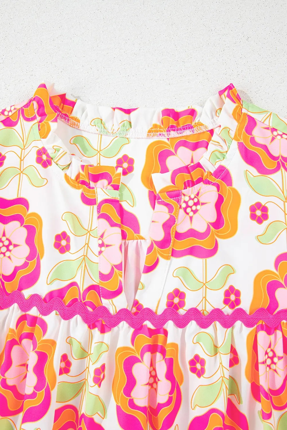 Floral Ruffled Sleeve Ric-Rac Trim Split Neck Loose Blouse