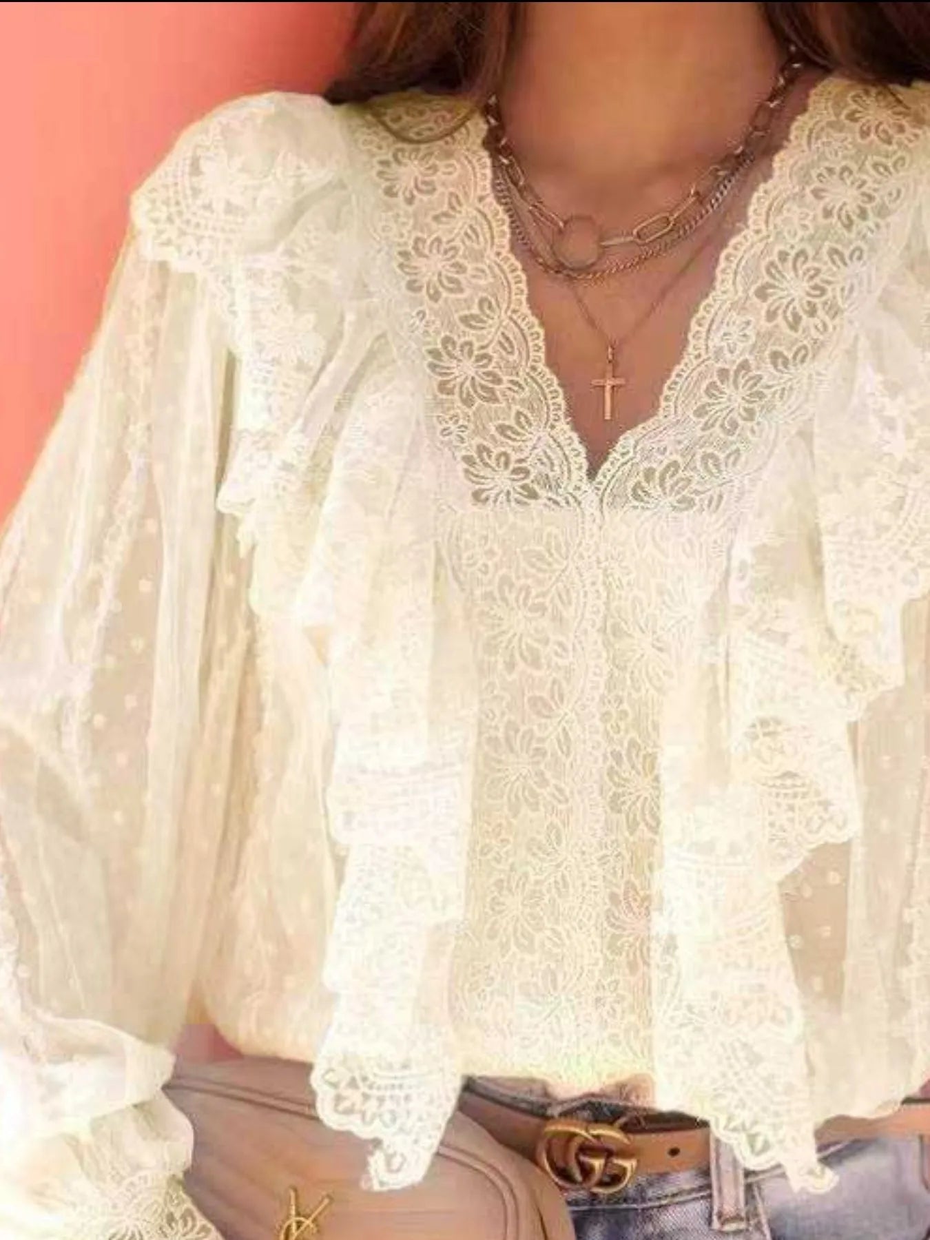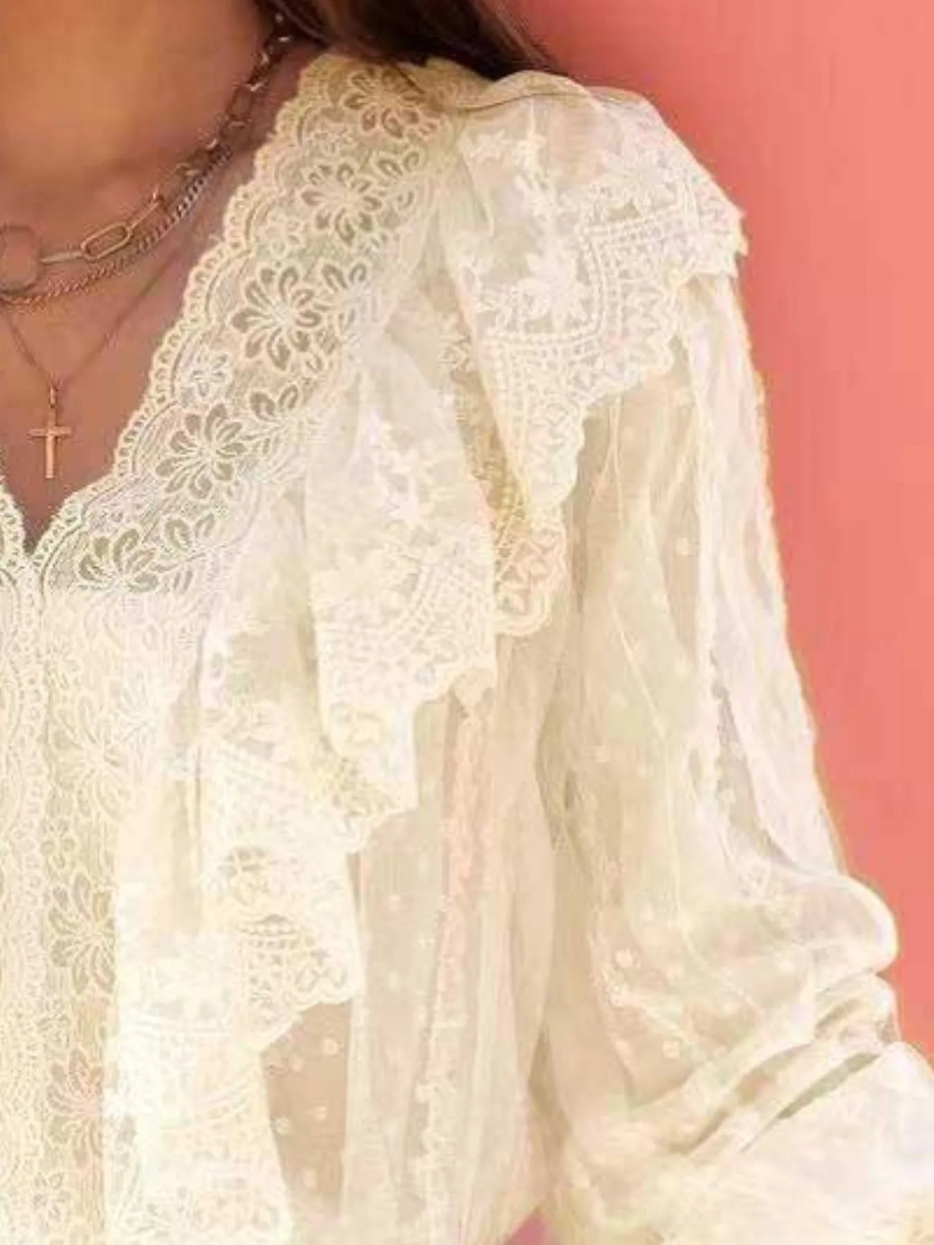 Lace Trim Ruffle V-Neck Long Sleeve Blouse