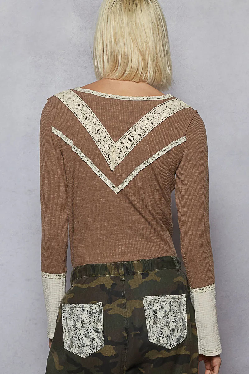 Stay stylish with this Ribbed Half Button Lace Detail Knit Top. The ribbed knit fabric provides a flattering fit while the half button design adds a touch of sophistication. The delicate lace detailing enhances the feminine look of this top, making it perfect for both casual and dressy occasions. Update your wardrobe with this chic and versatile piece today!