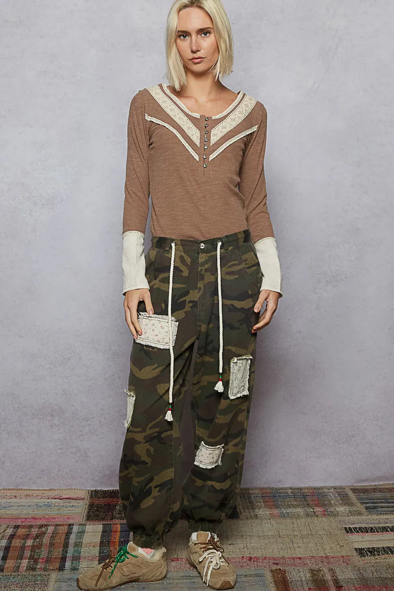 BiBi Camo Sleeve French Terry Top with Frayed Edge
