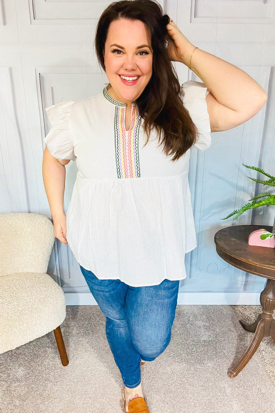 Weekend Ready Taupe Embroidered Notched Neck Babydoll Top