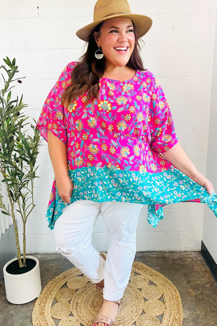 Vacay Ready Fuchsia Paisley Floral Dolman Sleeve Shark Bite Top