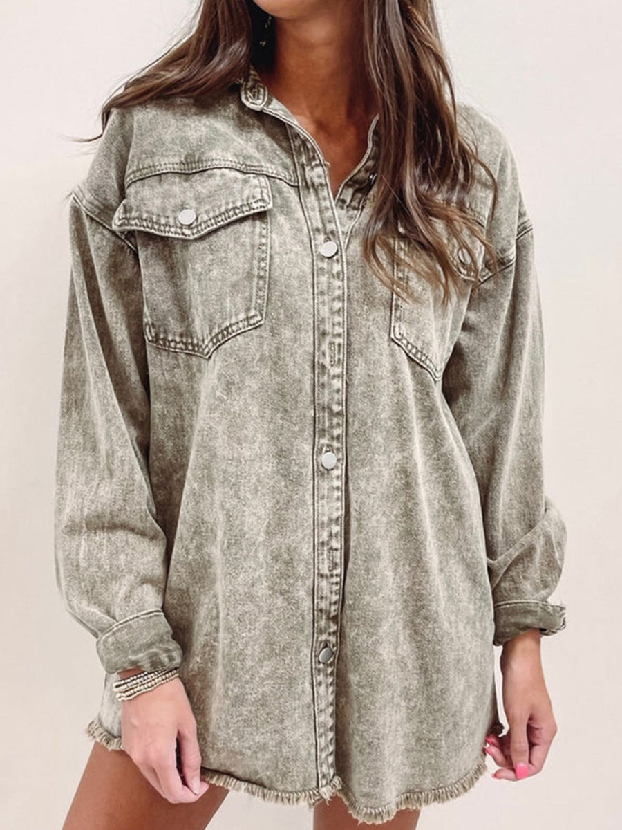 Raw Hem Button Up Long Sleeve Denim Jacket with Sequin Pockets