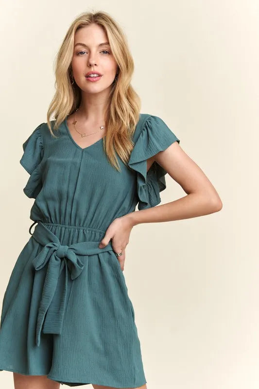 This romper features charming ruffle sleeves and convenient pockets. The combination of style and functionality makes it a versatile piece for any occasion. Stay comfortable and stylish with this cute ruffle sleeves romper.