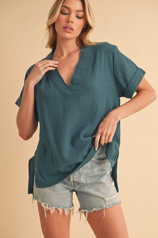 Aemi + Co Side Slit V-Neck Short Sleeve Blouse