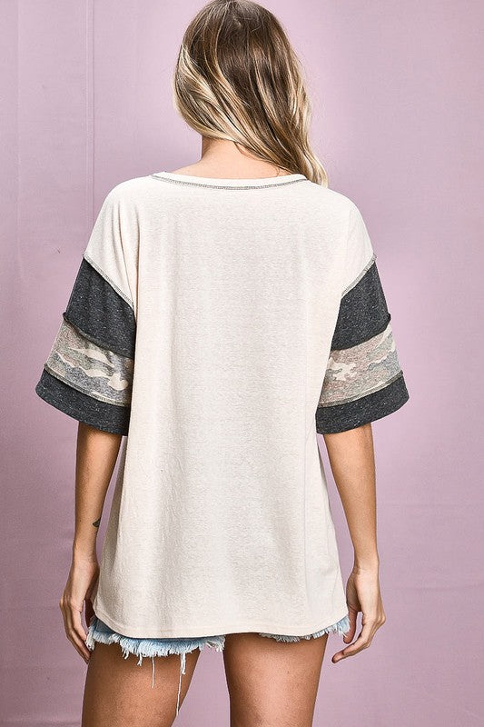 BiBi Triblend Knit Out Stitching Color Block Camo Top