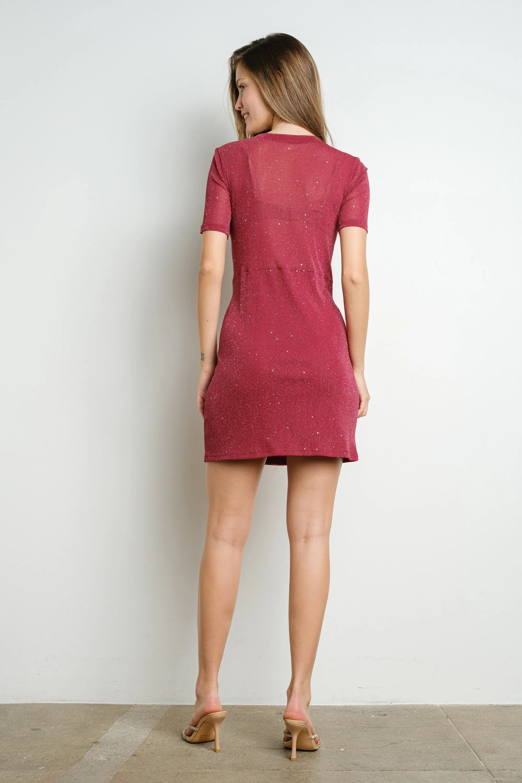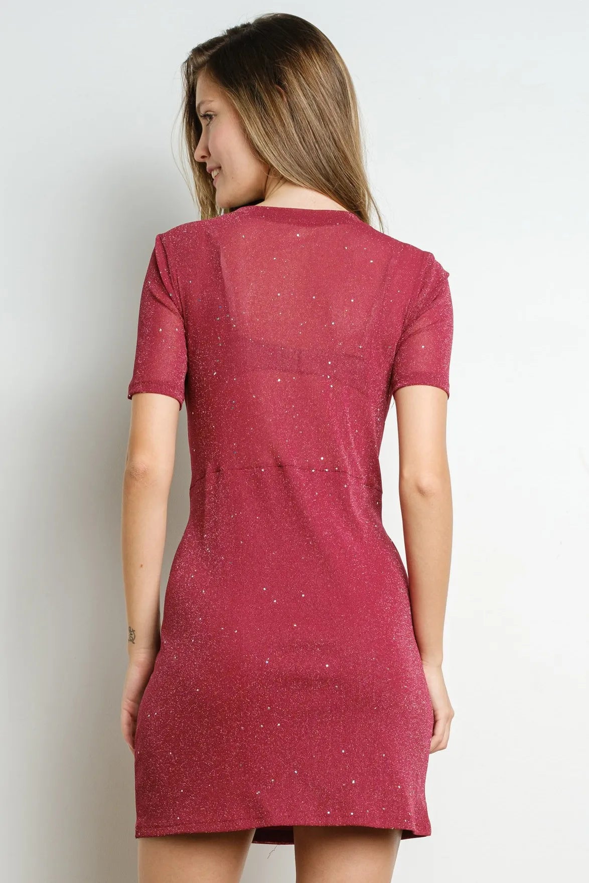 A twisted front glitter mini dress is a fun and glamorous option for a night out or a special event. This type of dress usually features a fitted silhouette with a twist or knot detail at the front, creating a stylish and flattering look. The glitter detailing adds a touch of sparkle and shimmer, making it perfect for parties or celebrations. The mini length adds a flirty and youthful vibe to the dress. You can pair it with heels and statement jewelry for a show-stopping ensemble.