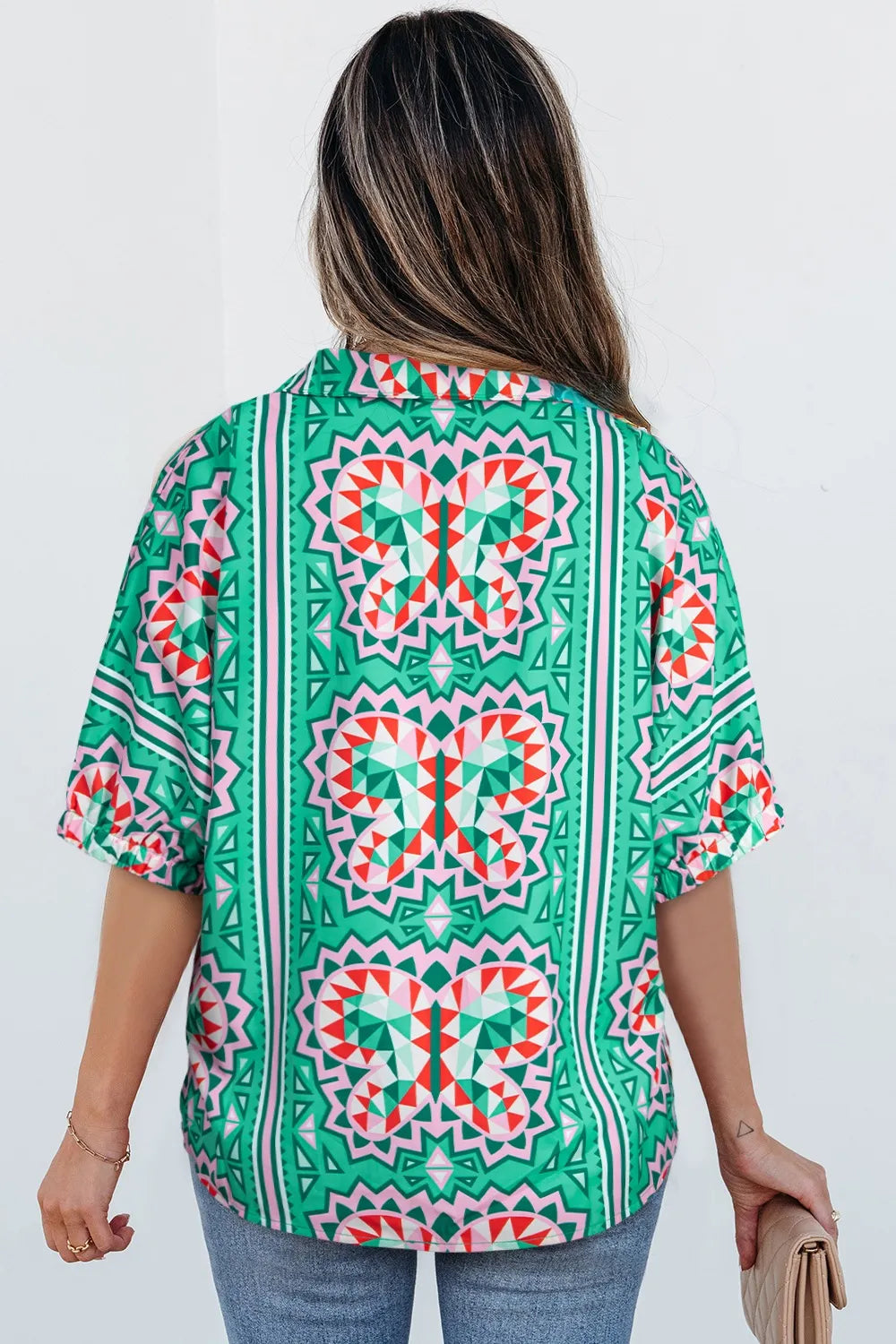 Boho Abstract Print Contrast Striped Collared V Neck Blouse