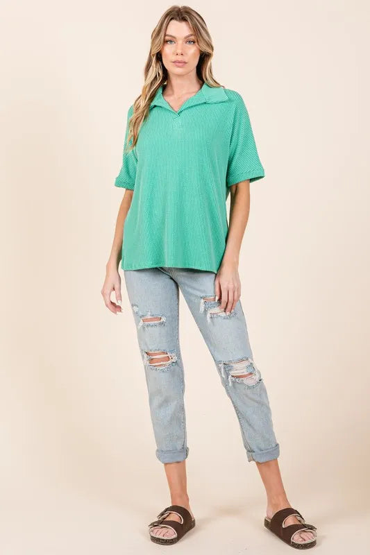 BOMBOM Ribbed Collared Neck Top