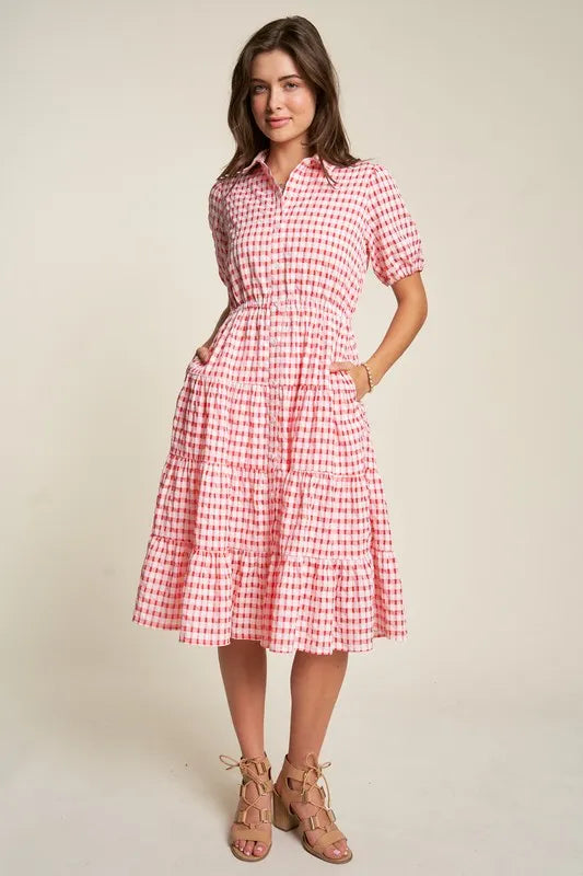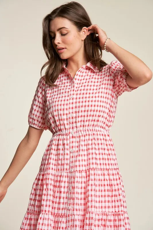 The Puff Short Sleeve Ruffle Shirt Dress is a trendy and elegant piece of clothing. The dress features a unique puff short sleeve design and delicate ruffle details, adding a touch of femininity to your look. Perfect for both casual outings and special occasions, this dress is sure to make a stylish statement.