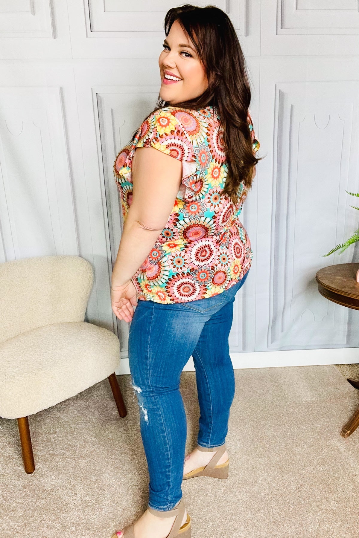 Perfect for your casual spring ensembles, this ruffle sleeve top features a round neck with an all-over multicolor medallion crochet print. Pair with your fav denim bottoms and flats for a cute but casual look.