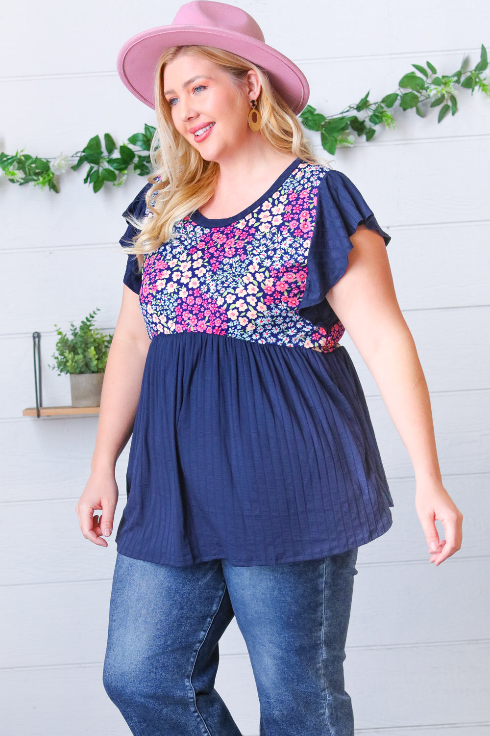 Navy Floral Yoke Babydoll Rib Flutter Sleeve Top