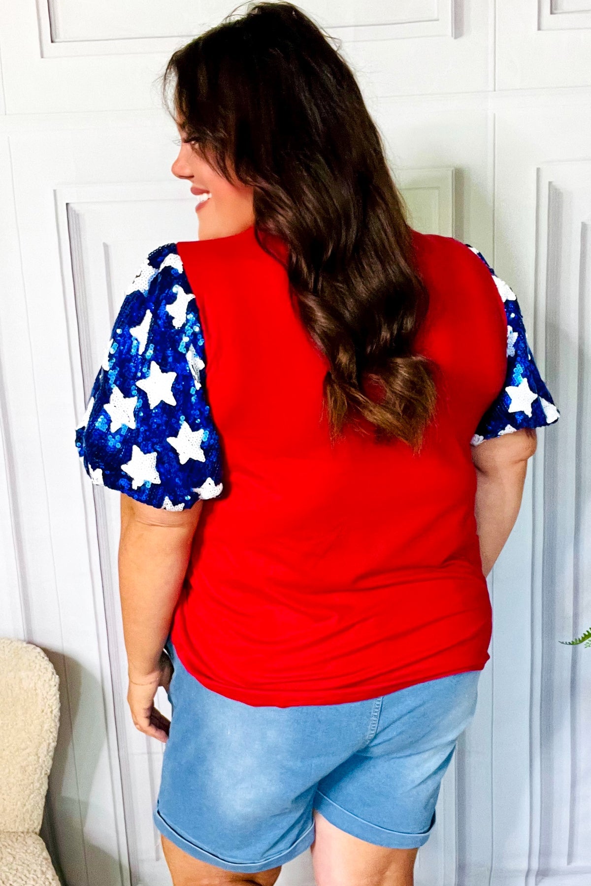 Feeling Patriotic Red & Blue Star Sequin Puff Sleeve Top