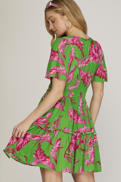 She + Sky Full Size Printed Notched Short Sleeve Frill Tiered Dress Plus Size