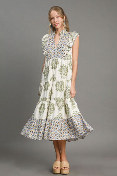 Umgee Full Size Mixed Print Ruffle Cap Sleeve Midi Dress Plus Size