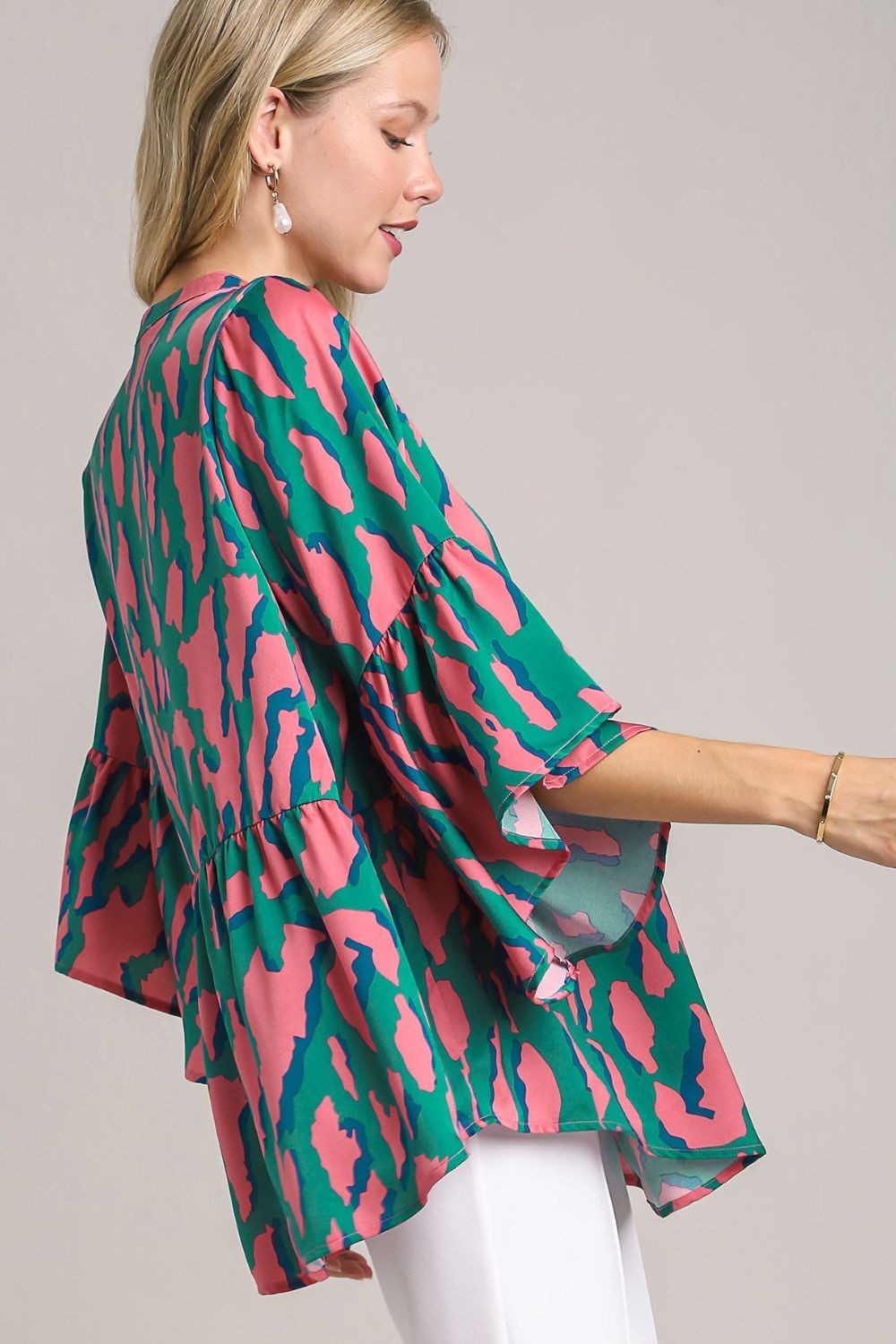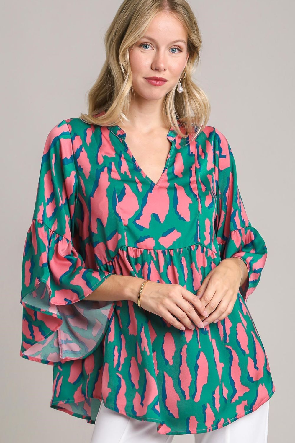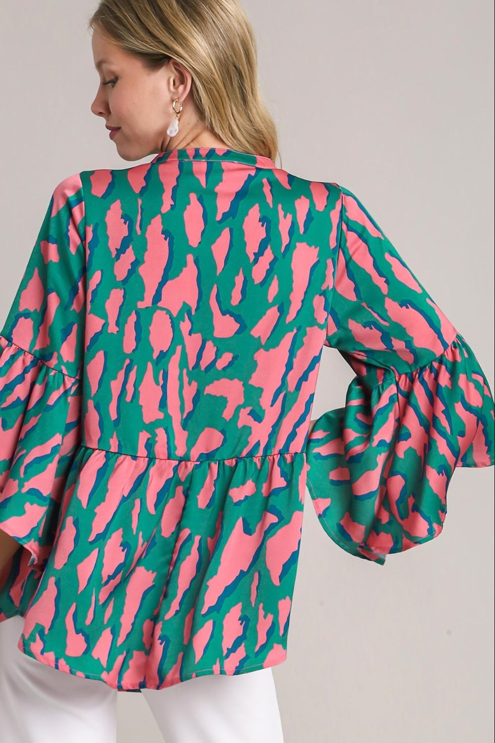 Umgee Full Size Satin Leopard 3/4 Bell Sleeve Babydoll Blouse Plus Size